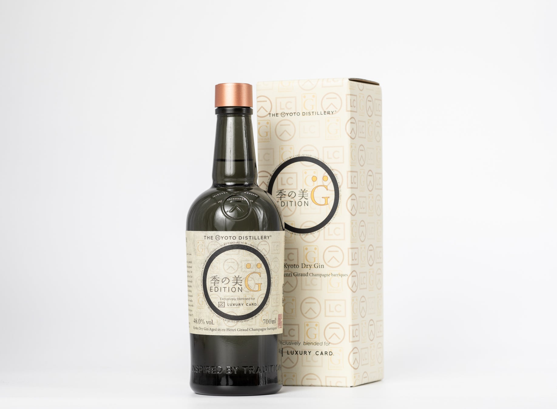 『季の美 エディションG exclusively blended for LUXURY CARD』は、1625 年創業のフランスの偉大なシャンパーニュメゾン「アンリ・ジロー(Henri Giraud)」 と「京都蒸溜所」と「ラグジュアリーカード」によるコラボレーションで誕生したカスクエイジドタイプのジンです。フランスから日本へ輸送した「アンリ・ジロー」の樽に「季の美 京都ドライジン」を詰めアルコール度数48度でボトリングしました。この度、京都蒸溜所とラグジュアリーカード両社の5周年を記念したコラボ商品として、各社のロゴをあしらったラグジュアリーカードオリジナルラベルとBOXで登場いたしました。