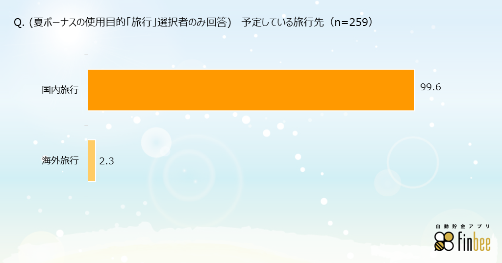 ・夏のボーナスで予定している旅行の行き先は、国内が99.6%と圧倒的に多く、海外予定は2.3%に留まる。
