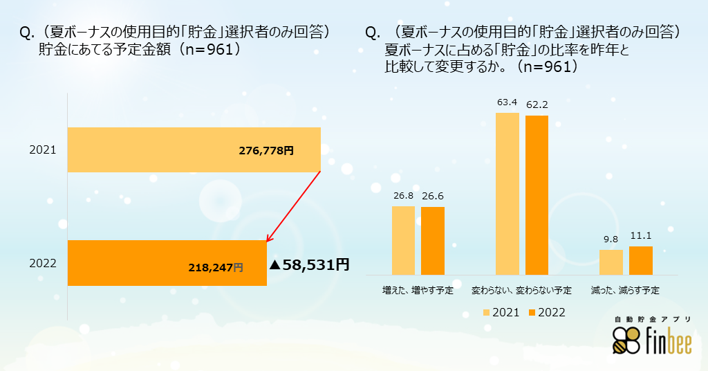 - 夏ボーナスから貯金にあてる平均金額は、218,247円。昨年から58,531円減少。