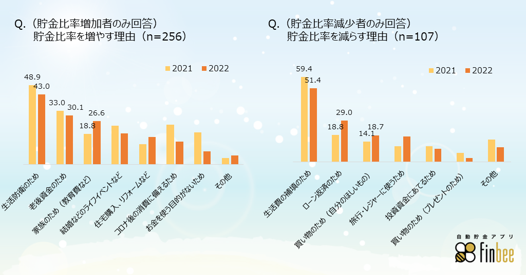 - 貯金にあてる金額を増やす理由では、「生活防衛費」の比率がやや下がり、家族のため(教育費等)、住宅といった目的が明確なものへの貯金が増加。