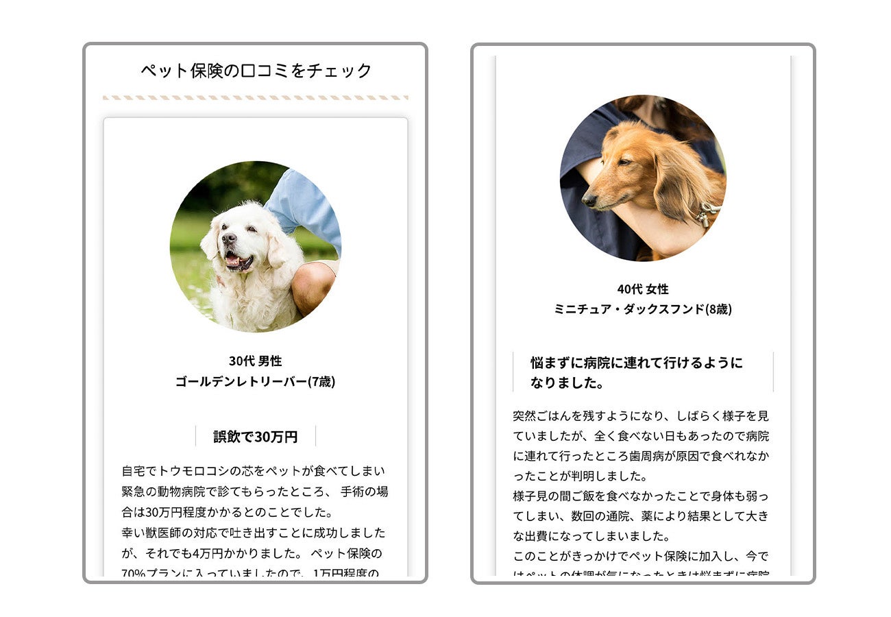 新たに追加した「口コミ」では、実際にペット保険を使われた利用者さまご自身の体験を具体的に紹介しております。ペット保険の加入や乗り換えをご検討のお客さまに、こうした実体験を判断材料としてぜひお役立ていただければ幸いです。