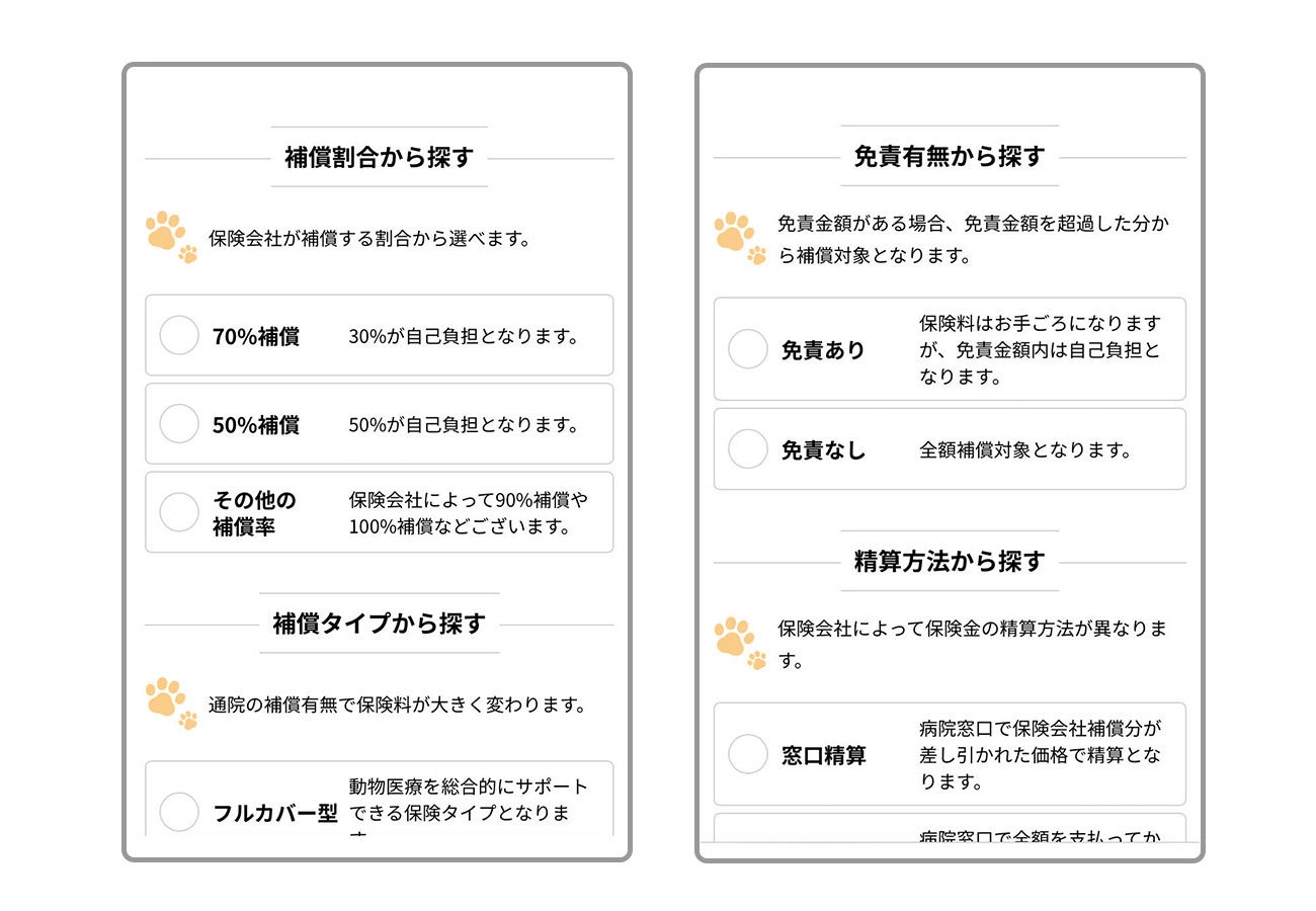 新たに追加した検索機能は、お客さまが「自ら条件を選んで探せる」というものです。補償割合、補償タイプ、免責の有無、清算方法の4つの項目から条件を選ぶと、当てはまるペット保険が表示されます。さらに、「オススメ順」「価格が安い順」というふたつの軸で保険を比較できるため、お客さまのご希望に添った保険を選びやすくなりました。