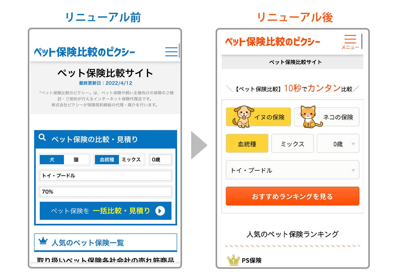 今回のリニューアルは、お客さまの保険選びという課題解決のために、サイトデザインの見直しと検索機能、口コミの充実を中心に実行しました。これらによって、ペット保険選びに対する難しさを親しみやすさに変え、より簡単により自分に合った保険選びができるよう改善しました。