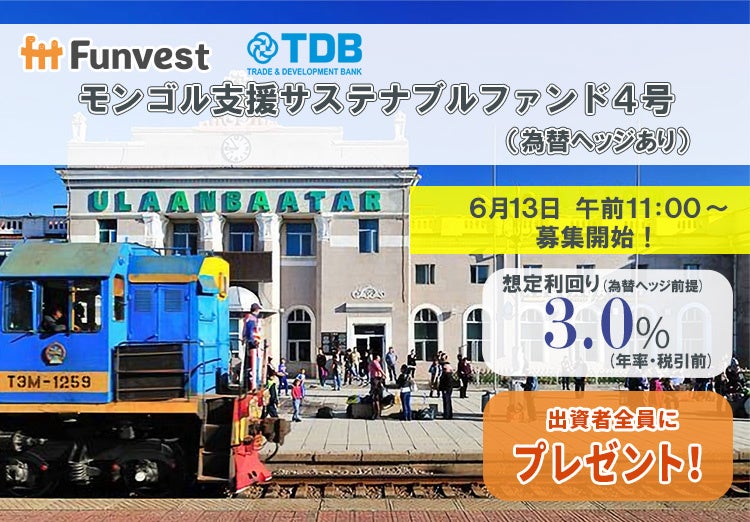 「未来をわかちあう投資」を提供する「Funvest(ファンベスト)」(以下、Funvest)は、「モンゴル支援サステナブルファンド4号(為替ヘッジあり)」(以下、本ファンド)の募集を6/13より開始しますので、お知らせいたします。