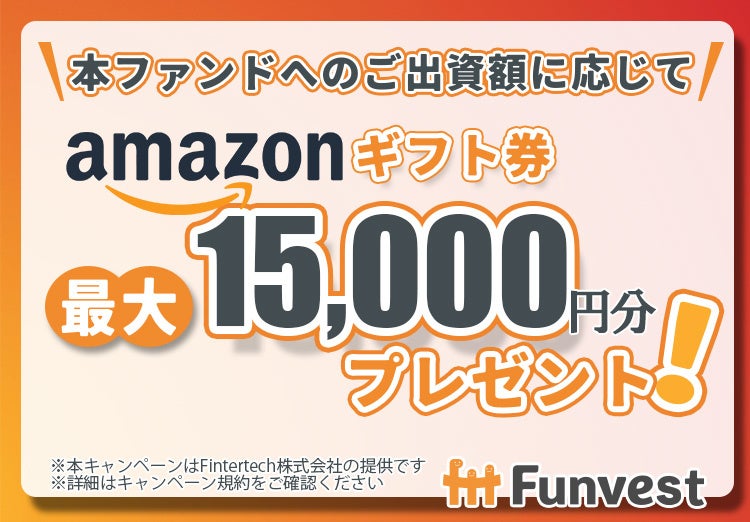 また、本ファンドへの出資額に応じて最大15,000円分のAmazonギフト券をプレゼントするキャンペーンを併せて実施いたします。