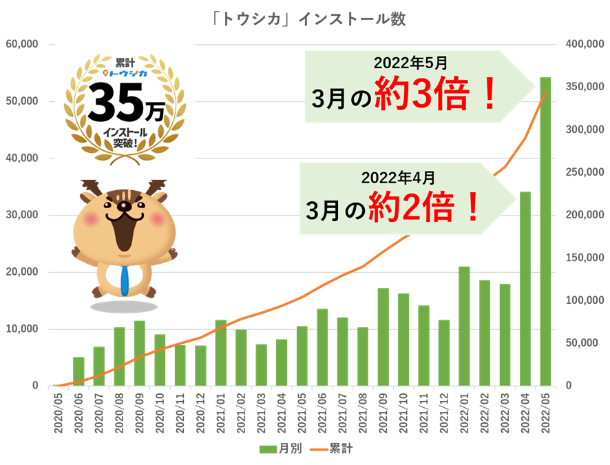 グリーンモンスター株式会社 (本社:東京都渋谷区 代表取締役:小川亮、以下「グリーンモンスター」)が提供するつみたて投資シミュレーションアプリ「トウシカ」のインストール数が、2022年3月比で4月は約2倍、5月は約3倍に急増しており、6月もこの勢いは継続し、累計インストール数は35万件を突破したことをお知らせいたします。