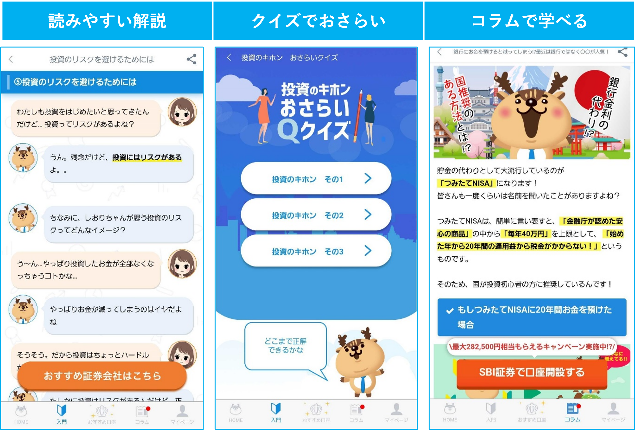 トウシカは「投資を始めたいけど知識がない」、「老後2000万円問題って何?どうすればいいの?」、「投資?損したくないし、リスクを取りたくない…」、「投資の選択肢が多くて何を選べばいいのかわからない」、そんな投資入門者の疑問を解決する無料アプリです。