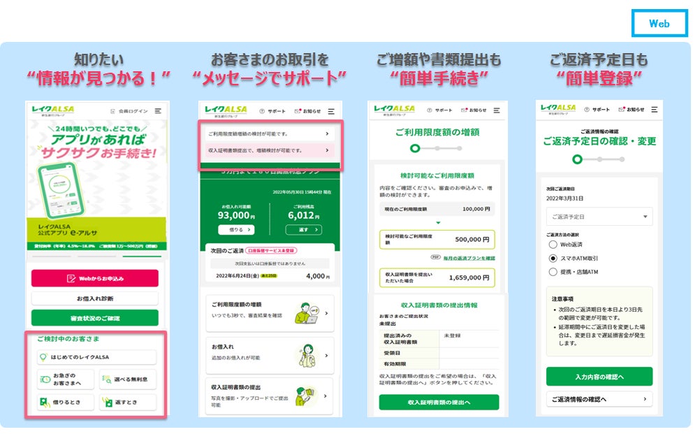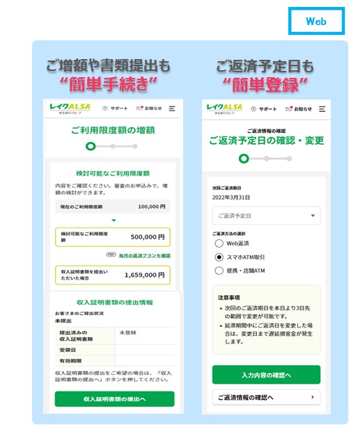 ・ご増額、収入証明書提出など、すぐに知りたい情報をご確認いただき、Webで簡単に手続きができるだけでなく、ご返済約束日の変更など簡単に登録できます。