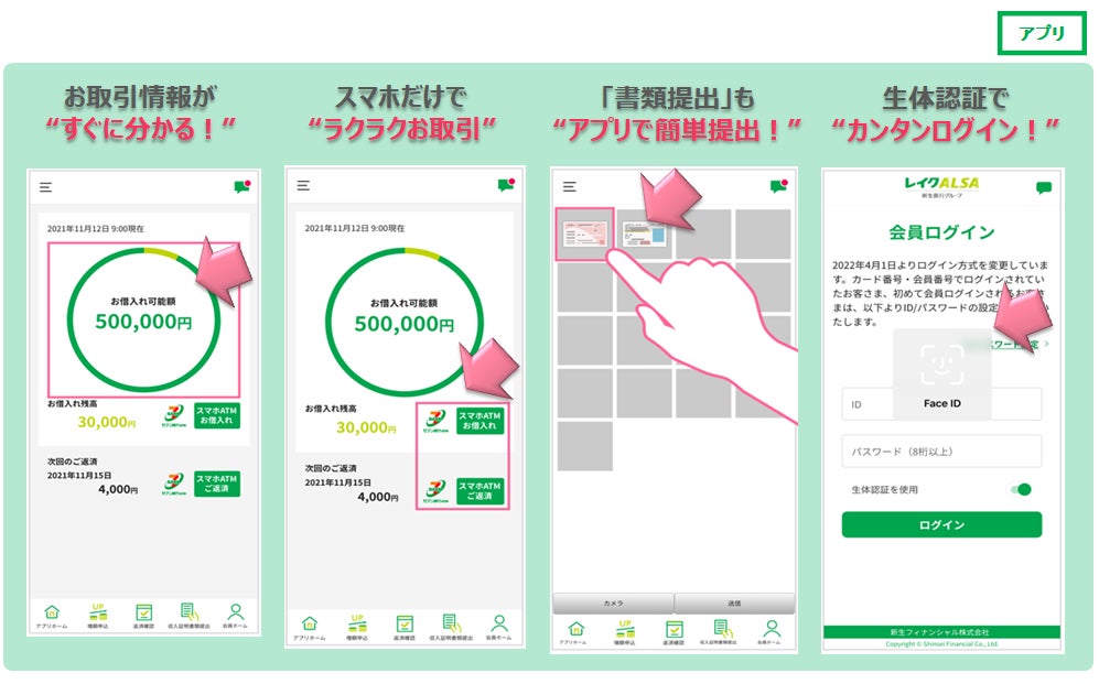 ・生体認証で、ログイン情報の入力無しに、残高・ご返済日・ご返済額などのお取引情報が確認できます。