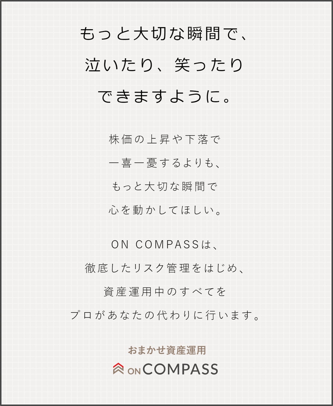ON COMPASSは、資産運用をおまかせできるサービスです。金融工学に基づき、感情や直感に惑わされることなく専門家が、お客さまの資産運用プランに沿って運用を行います。面倒な投資判断や売買、リバランスなどは一切不要です。株価の値動きが気になっている方に向けて、専門家にまかせる、という選択肢があるというメッセージを本企画では伝えています。