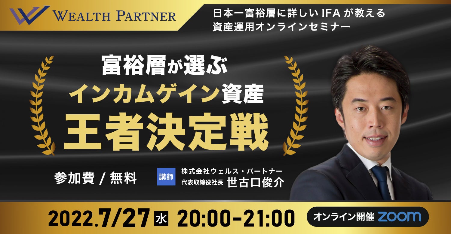 富裕層向けにIFA事業始め、資産運用のコンサルティングを行う株式会社ウェルス・パートナー(代表取締役:世古口俊介、本社:東京都港区、以下「当社」)は、オンラインセミナー「日本一富裕層に詳しいIFAが教える資産運用オンラインセミナー 富裕層が選ぶインカムゲイン資産・王者決定戦」を2022年7月27日(水)20:00〜21:00に開催いたします。
