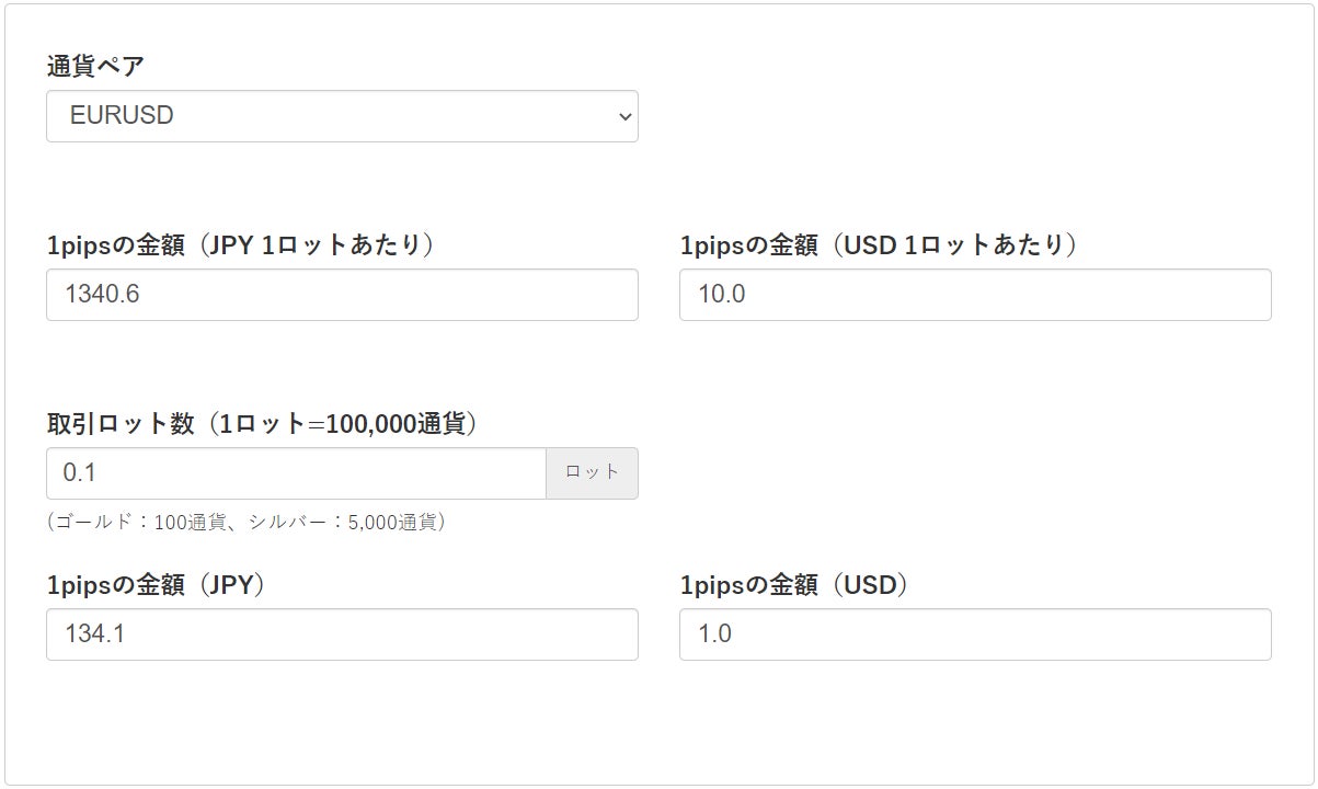 「取引ロット数」の箇所に、持っているポジションのロット数を入力することで、そのロットに対する1pipsも自動計算してくれます。