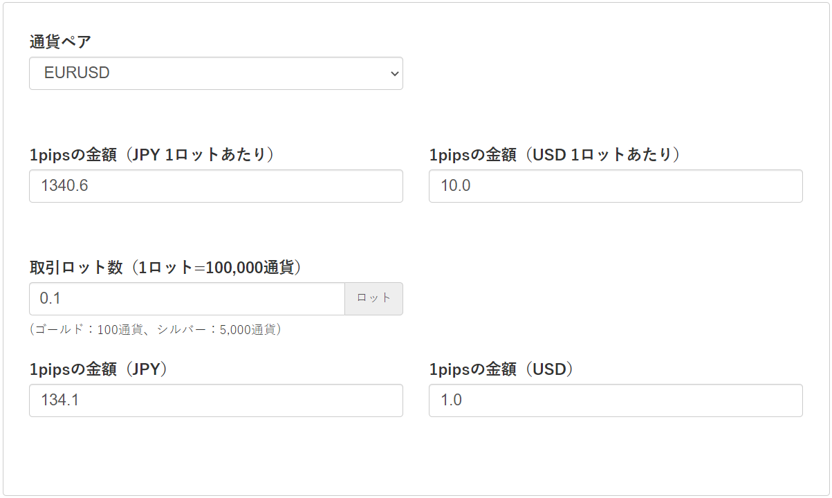 「取引ロット数」の箇所に、持っているポジションのロット数を入力することで、そのロットに対する1pipsも自動計算してくれます。