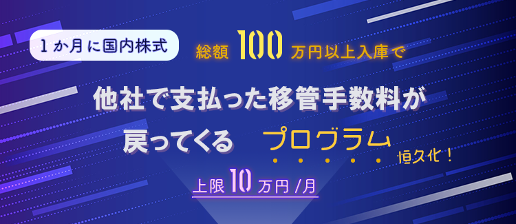 | プログラム内容 | 他社からの国内株式入庫でお客様が支払った移管手数料をキャッシュバックいたします。 |