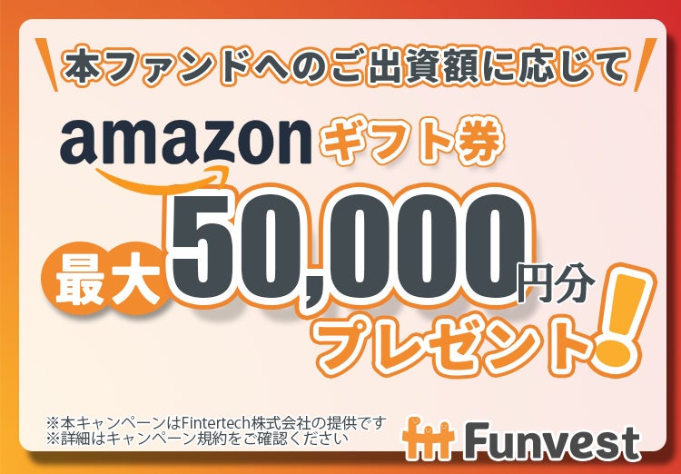 また、本ファンドへの出資額に応じて最大50,000円分のAmazonギフト券をプレゼントするキャンペーンを併せて実施いたします。
