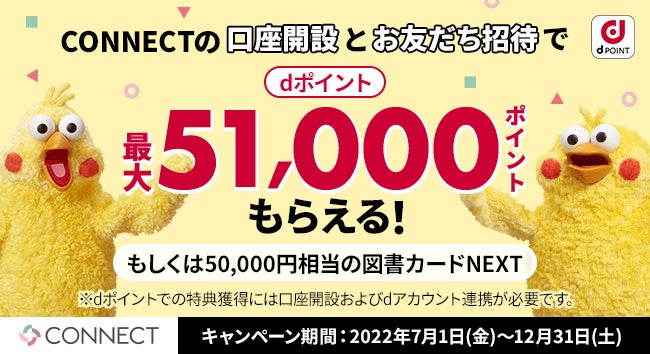 大和証券グループの株式会社CONNECT(本社:東京都中央区、代表取締役:大槻 竜児、以下「CONNECT」)は、2022年7月1日(金)より『dポイントがもらえる! お友だち招待キャンペーン』を開始いたします。