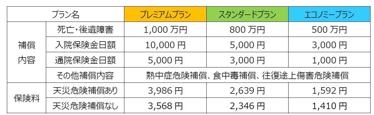 ・ケガの補償に加え、熱中症および食中毒の補償を基本補償としています。