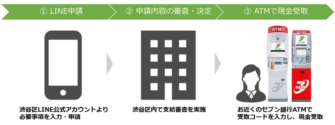 このたび、セブン・ペイメントサービスが提供する、銀行口座を介さず現金を受取ることができる「ATM受取(現金コース)」のサービスを活用することで、渋谷区LINE公式アカウントから助成金を申請し、セブン銀行ATMから現金で受取る仕組みを整備しました。