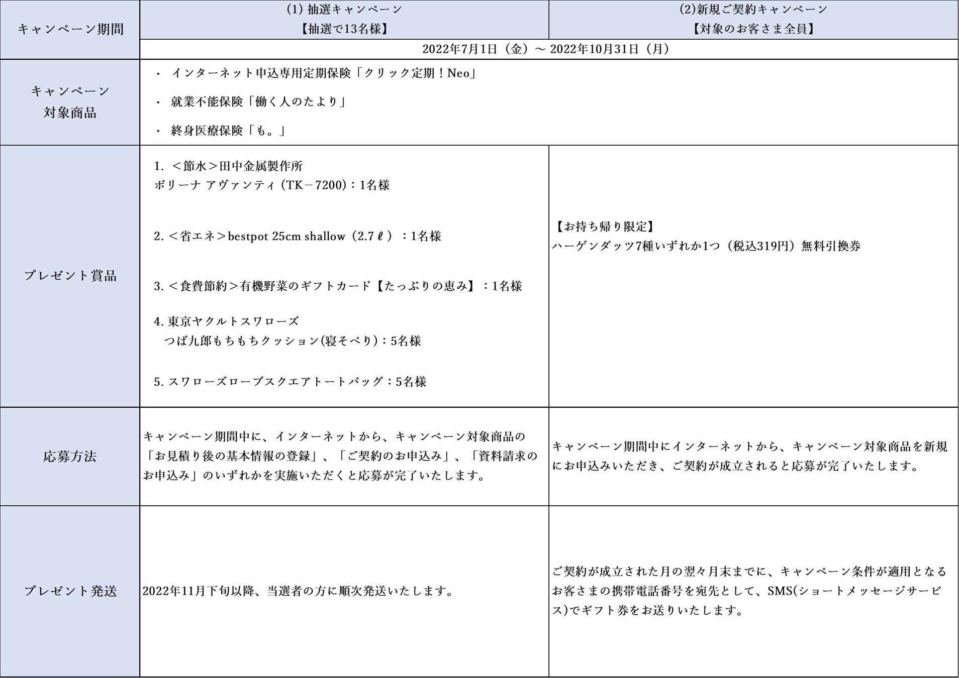 キャンペーン対象商品は、インターネット申込専用定期保険「クリック定期!Neo」、就業不能保険「働く人のたより」、終身医療保険「も。」の3商品です。