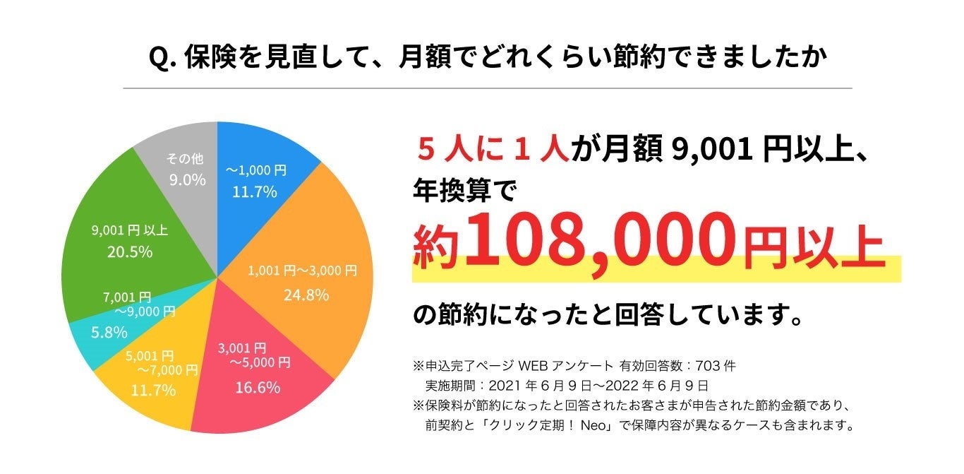 家計の見直しをきっかけに「クリック定期!Neo」にお申込みされたお客さま(703名)を対象にしたアンケートでは、5人に1人の方が月額9,001円以上、年換算で約108,000円以上の節約になったと回答されています。