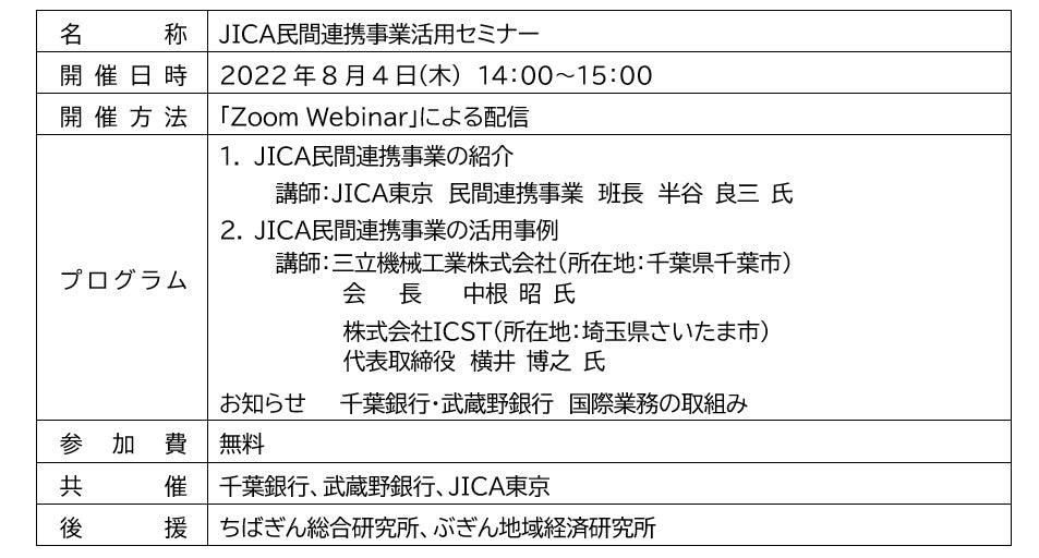 千葉銀行(頭取 米本 努)は、武蔵野銀行(頭取 長堀 和正)との業務提携「千葉・武蔵野アライアンス」に基づく提携施策として、2022年8月4日(木)、独立行政法人国際協力機構(以下、JICA)が実施している民間連携事業や海外進出に関心のある事業者を対象としたオンラインセミナー「JICA民間連携事業活用セミナー」を開催します。