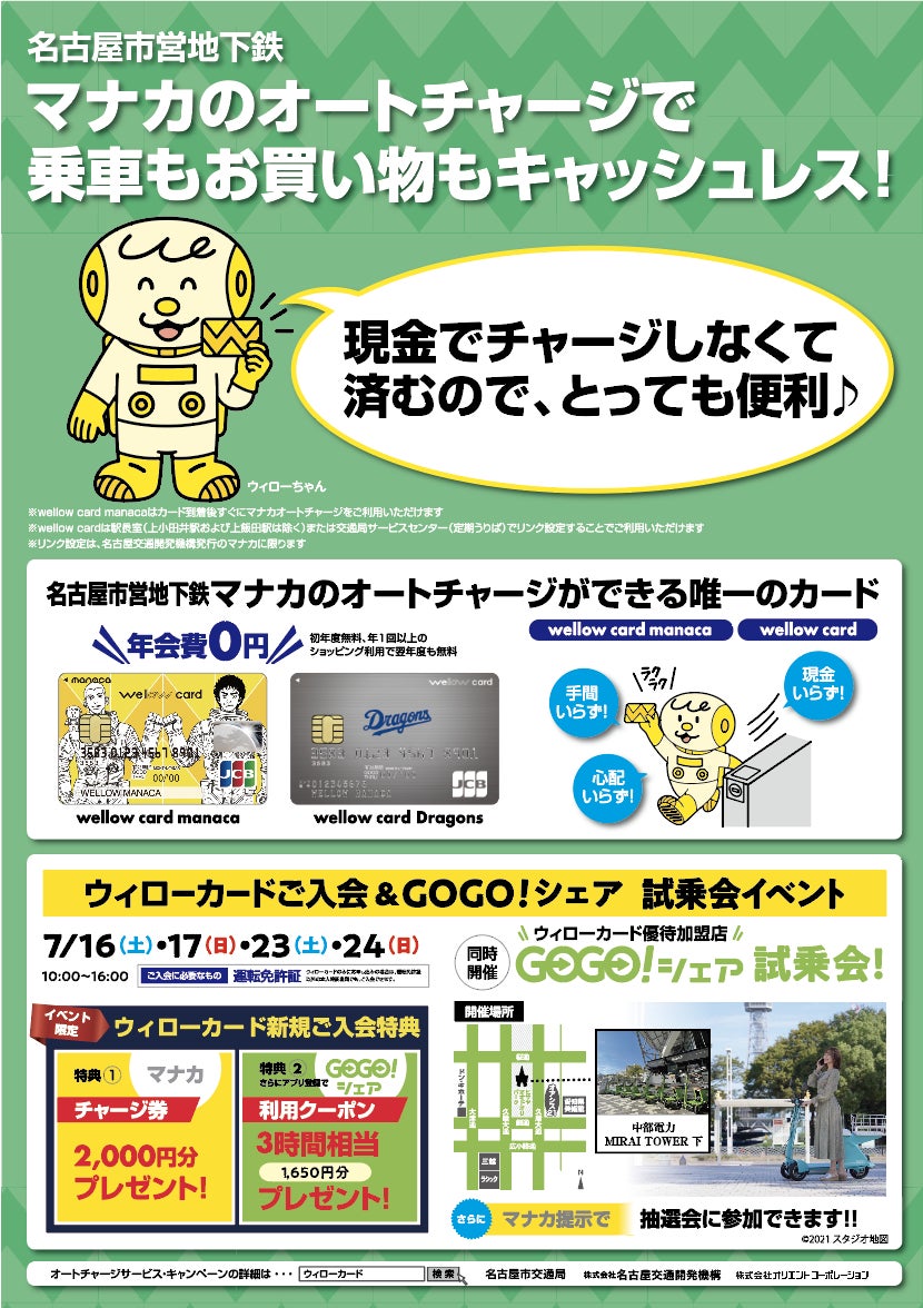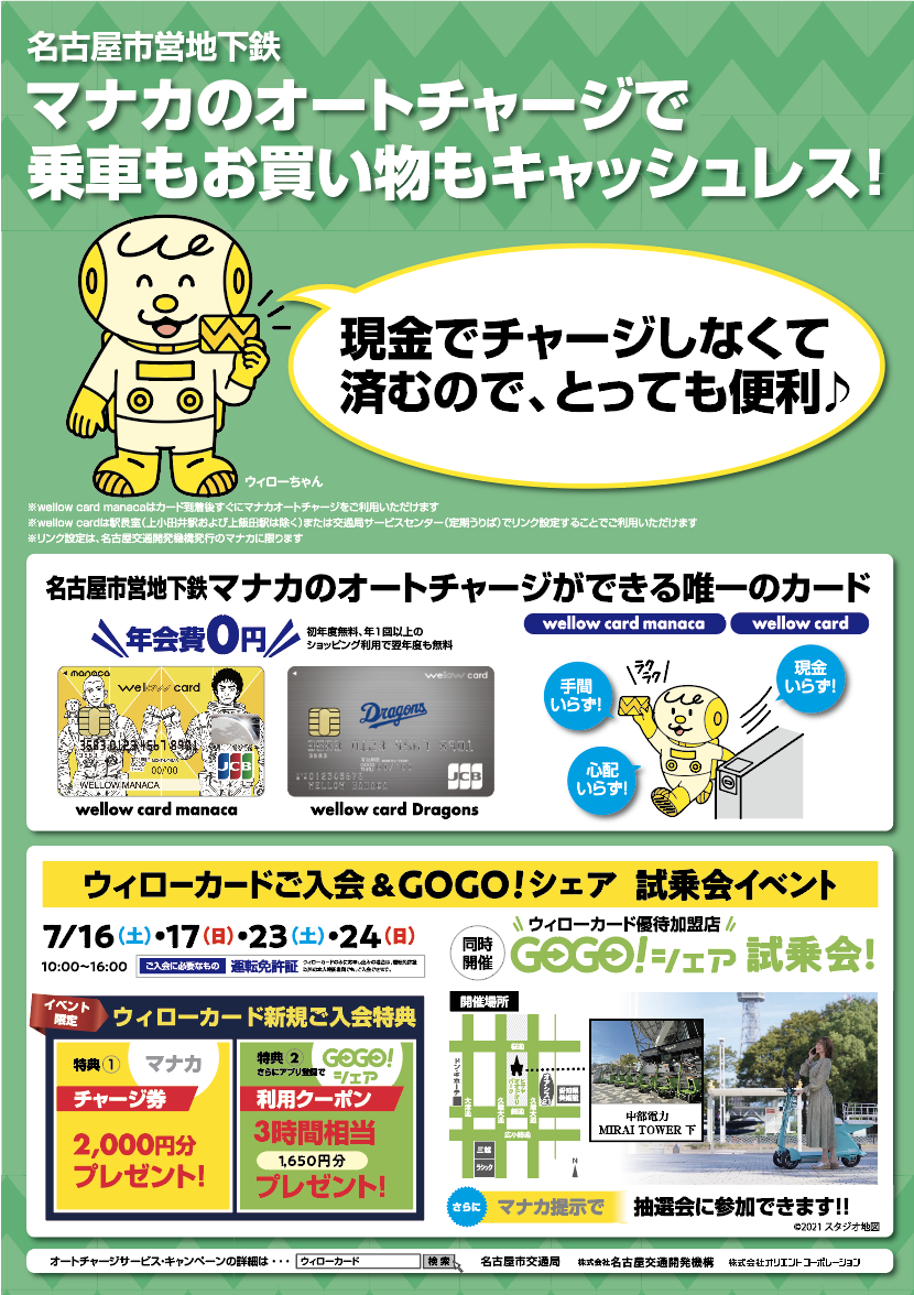 期間中、イベント会場でウィローカードに新規ご入会でマナカチャージ券2,000円分プレゼント。さらにGOGOシェアのアプリ登録で3時間相当(1,650円分)の利用クーポンをプレゼント!