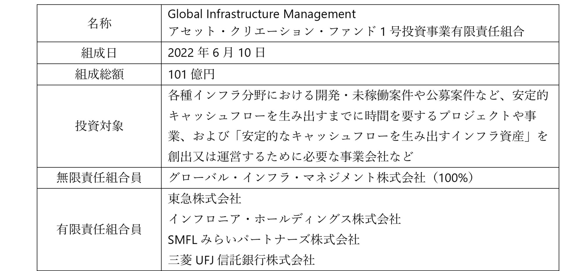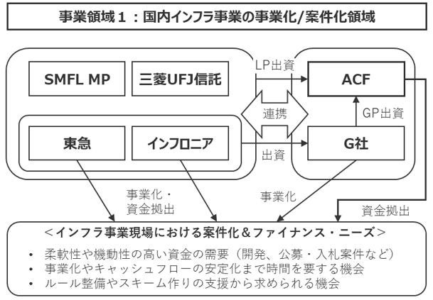 ACFは、グローバル・インフラ・マネジメント株式会社(代表取締役:岐部 一誠、土田 博志、以下「G社」)が無限責任組合員(GP)としてインフラ開発・運用改善を行い、G社の株主である東急株式会社(代表取締役社長:髙橋 和夫、以下「東急」)、およびインフロニア・ホールディングス株式会社(代表執行役社長:岐部 一誠、以下「インフロニア」)に加えて、三菱UFJ信託銀行株式会社(取締役社長:長島 巌、以下「三菱UFJ信託」)とSMFLみらいパートナーズが有限責任組合員(LP)として参画し、協働して事業化を推進してまいります。