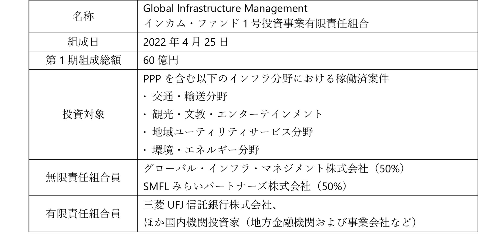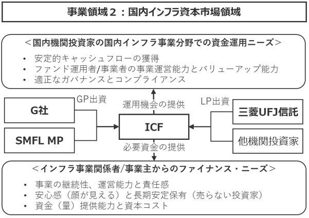 ICFは、SMFLみらいパートナーズとG社が共同無限責任組合員(GP)として、三菱UFJ信託をはじめとする国内機関投資家にインフラ事業分野における安定的キャッシュフローを得るための運用機会を提供し、国内インフラ資本市場の創出を図ります。