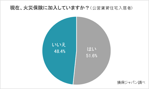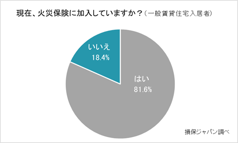 賃貸住宅に入居するにあたっては、万一の火災による大家への賠償責任などを補償する特約を付帯した家財保険の加入が欠かせませんが、損保ジャパンが実施したアンケート結果によると、一般賃貸住宅入居者の18.4%、公営賃貸住宅入居者の48.4%が更新漏れなどによって家財保険に加入していないことがわかりました。※2