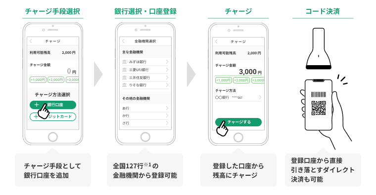 ウォレットステーションのバーコード決済を利用する際に、ユーザが登録した銀行口座から決済金額を即時に引き落とすことが可能です。