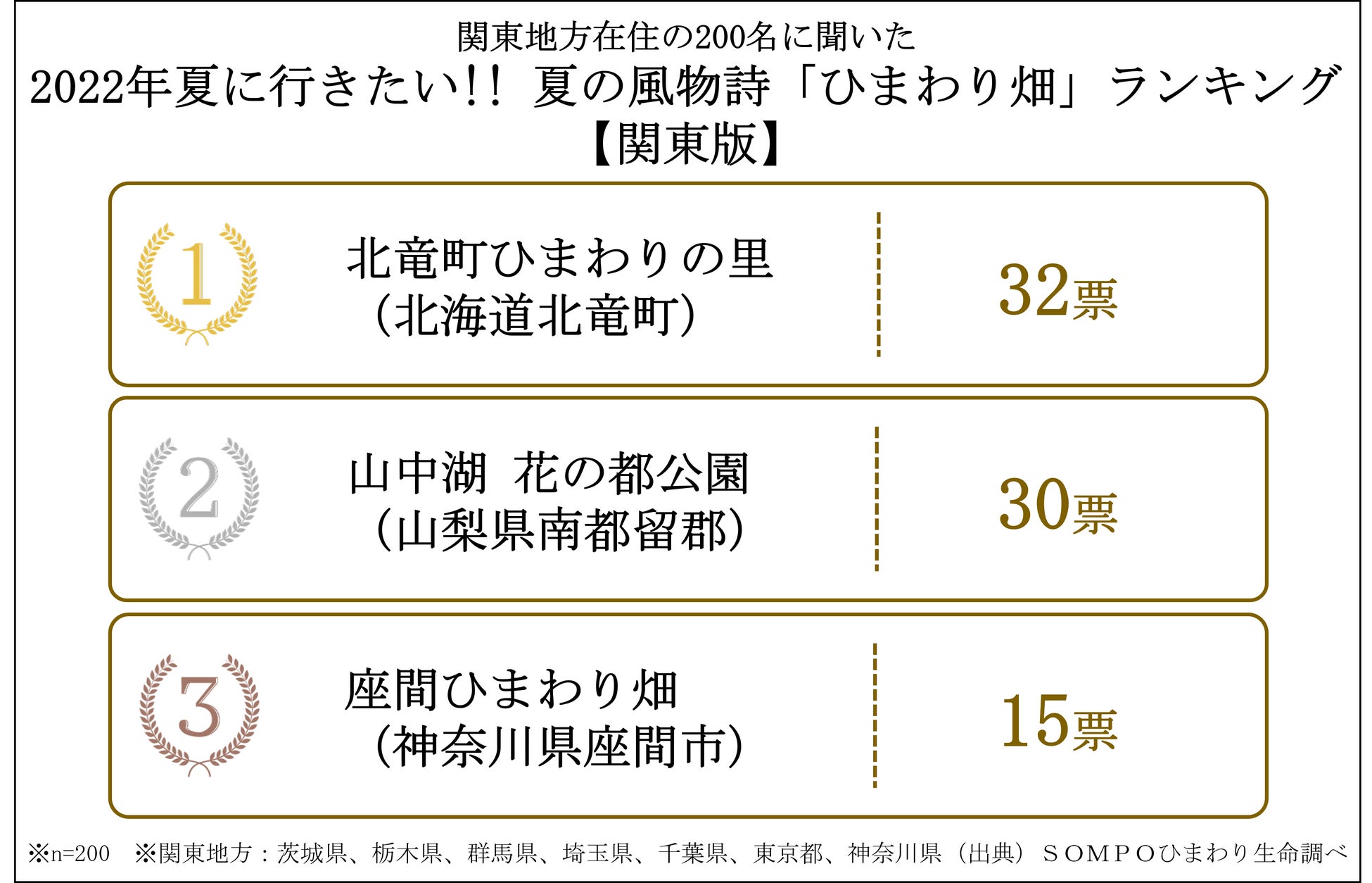 一方で、関東在住の方々は、北竜町ひまわりの里(北海道北竜町)と、山中湖 花の都公園(山梨県南都留郡)の回答が多く、関東地方の座間ひまわり畑(神奈川県座間市)は3位にランクインする結果となりました。また、各地方ランキングを見ても、北竜町ひまわりの里(北海道北竜町)と、山中湖 花の都公園(山梨県南都留郡)が上位にランクインしていることが多く、上位2か所が3位に、80票以上の差をつけた要因と考えられます。