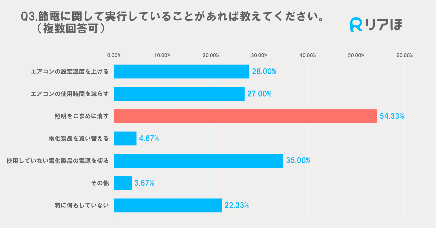 節電に関して実行していることに関しては、「照明をこまめに消す」が最も多く54.33%、次いで「使用していない電化製品の電源を切る」が35%、「エアコンの設定温度を上げる」が28%の順となりました。