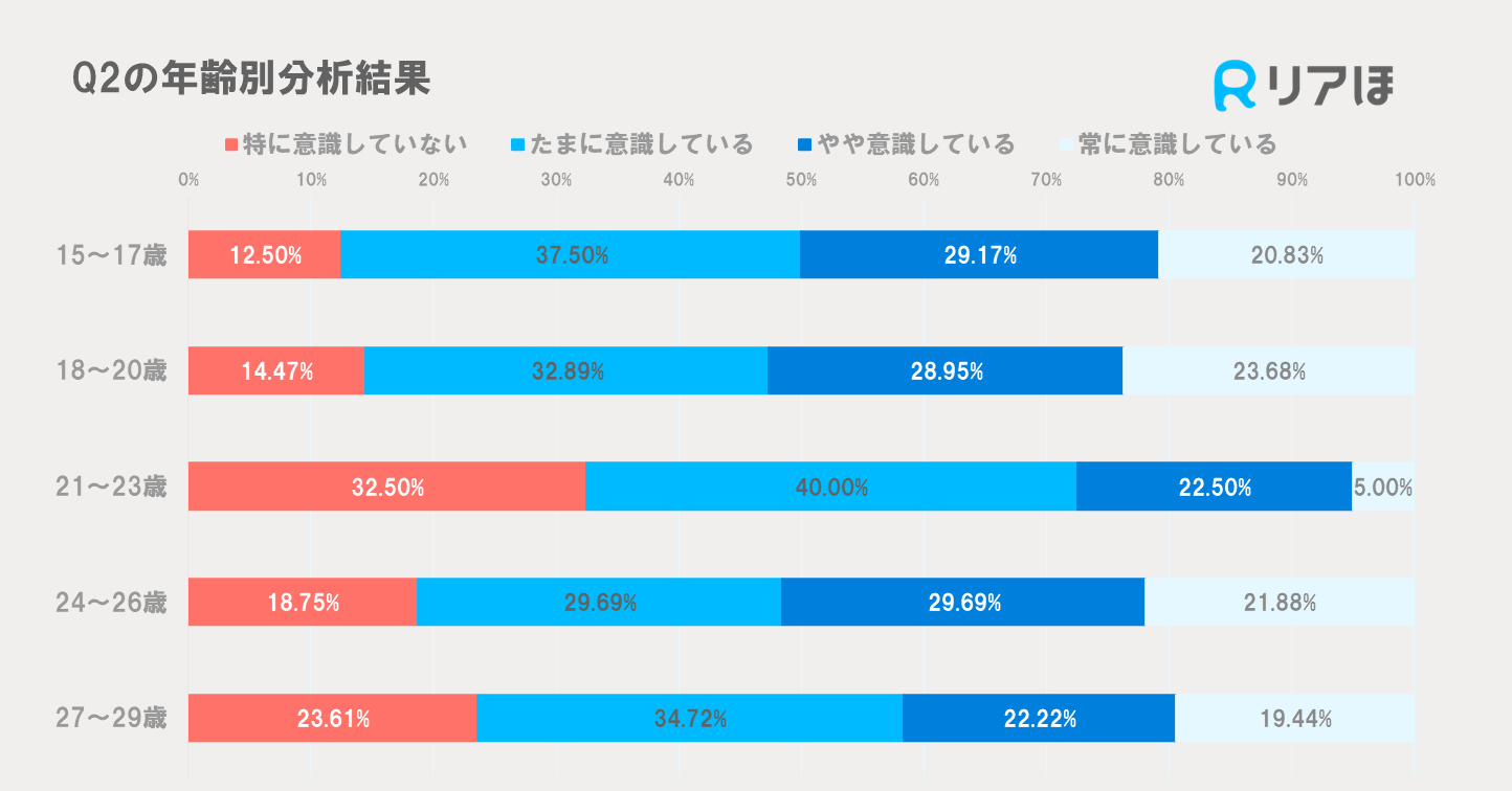 Q2の回答を年齢別に集計したところ、「特に意識していない」の割合が最も多かったのが21歳~23歳男女の32.5%となり、「常に意識している」と回答した方は5%と、最も低い結果となりました。