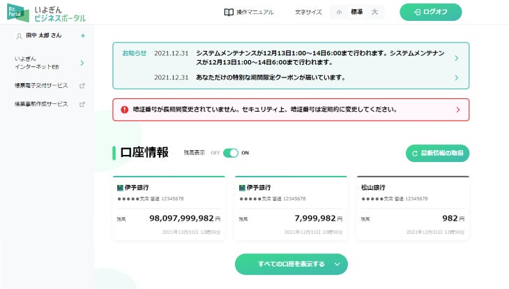 株式会社マネーフォワードは、株式会社伊予銀行が提供する事業者向けデジタルサービスの総合Webサイト『いよぎんビジネスポータル』に、アカウントアグリゲーション基盤を提供します(2022年8月8日予定)。これにより、『いよぎんビジネスポータル』の利用事業者は、伊予銀行以外の金融機関の口座残高・取引明細を一元管理できるようになります。