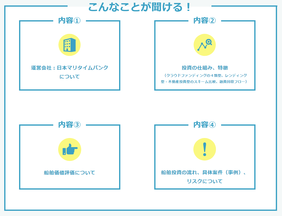 日本初の船舶投資型クラウドファンディングサービス「マリタイムバンク」を提供する日本マリタイムバンク株式会社(本社:東京都中央区、代表取締役:昼田 将司)は、2022年7月から毎月『船舶投資について詳しく知るオンラインセミナー』を開催いたします(事前申込制、各回20名定員)。セミナーでは、「船舶投資とは?」「クラウドファンド・レンディング・資金運用・運用利回り」などについて詳しくご説明します。