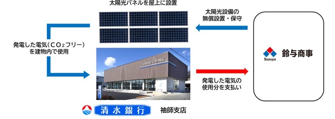 鈴与商事株式会社(本社:静岡市、代表取締役社長:伊藤正彦、以下、鈴与商事)と株式会社清水銀行(本店:静岡市、代表取締役頭取:岩山 靖宏、以下、清水銀行)は、同行袖師支店の屋上に、オンサイトPPAモデル※(以下、本モデル)により太陽光発電設備を設置し、同支店建物で使用する電気の一部を再生可能エネルギーへ切り替えることで、環境・社会・経済におけるサステナビリティの実現に取り組んで参ります。