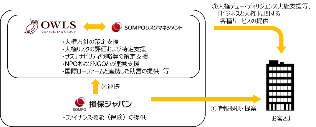 また、SOMPOリスクとオウルズは連携し、お客さまのご要望に応じて、人権デュー・ディリジェンス実施支援等の「ビジネスと人権」に関する各種サービスを提供していきます。