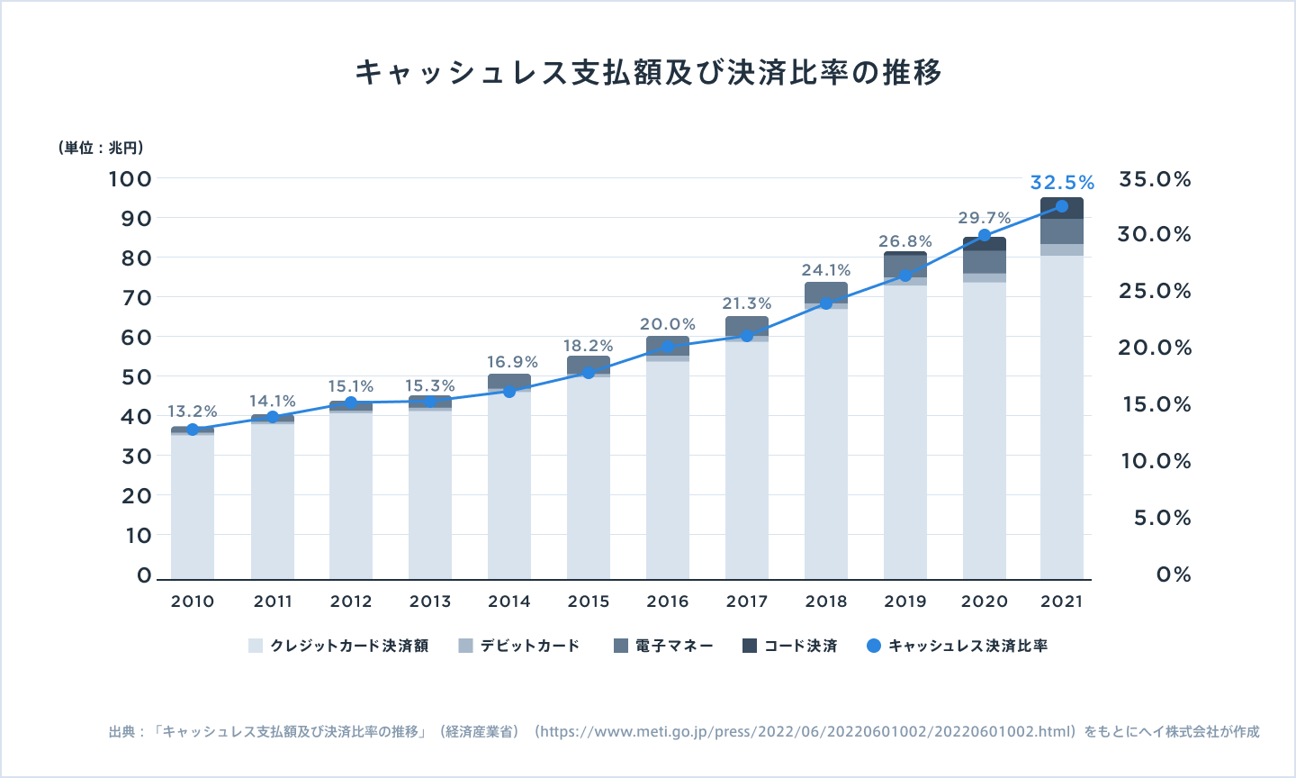 経済産業省は、キャッシュレス決済比率を2025年までに4割程度まで上昇させることを目指してキャッシュレス決済の推進に取り組んでおり、2021年は32.5%まで伸長しました。
