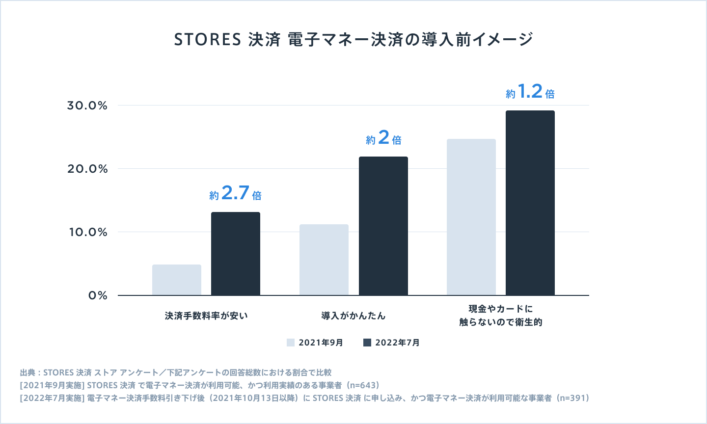 また、電子マネー決済を導入する前のイメージで「決済手数料率が安い」と回答した事業者数は、2021年9月に実施したアンケートと比較し、約2.7倍に増加。