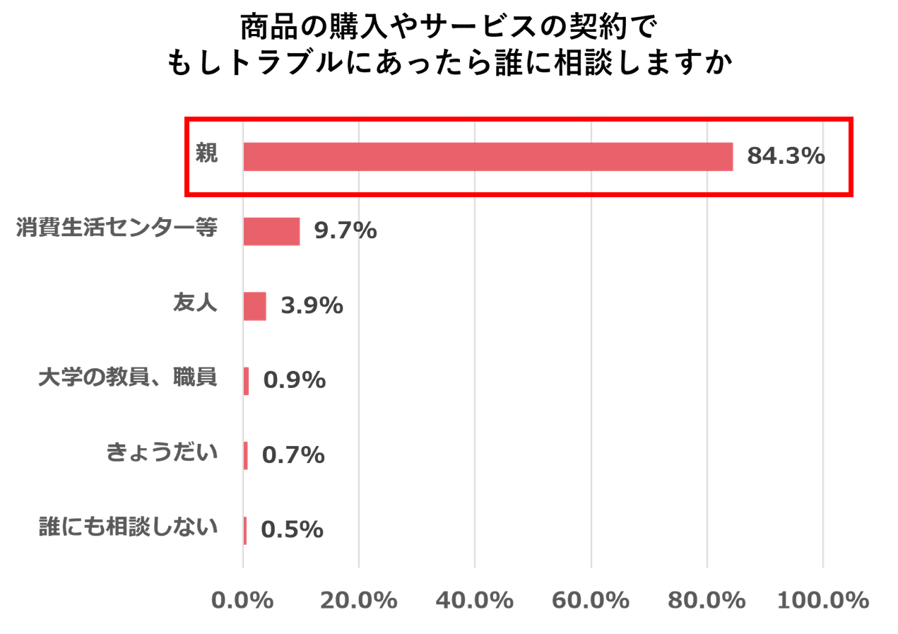 最後に、商品の購入やサービスの契約でトラブルに見舞われた際、誰に相談するかと尋ねたところ、「親」と答えた学生は84.3%と圧倒的に多い結果となりました。成人となり様々な契約ができるようになった一方で、まだ親から経済的に独立しきれていないことから親のサポートを必要とする学生が多い実態がみえます。