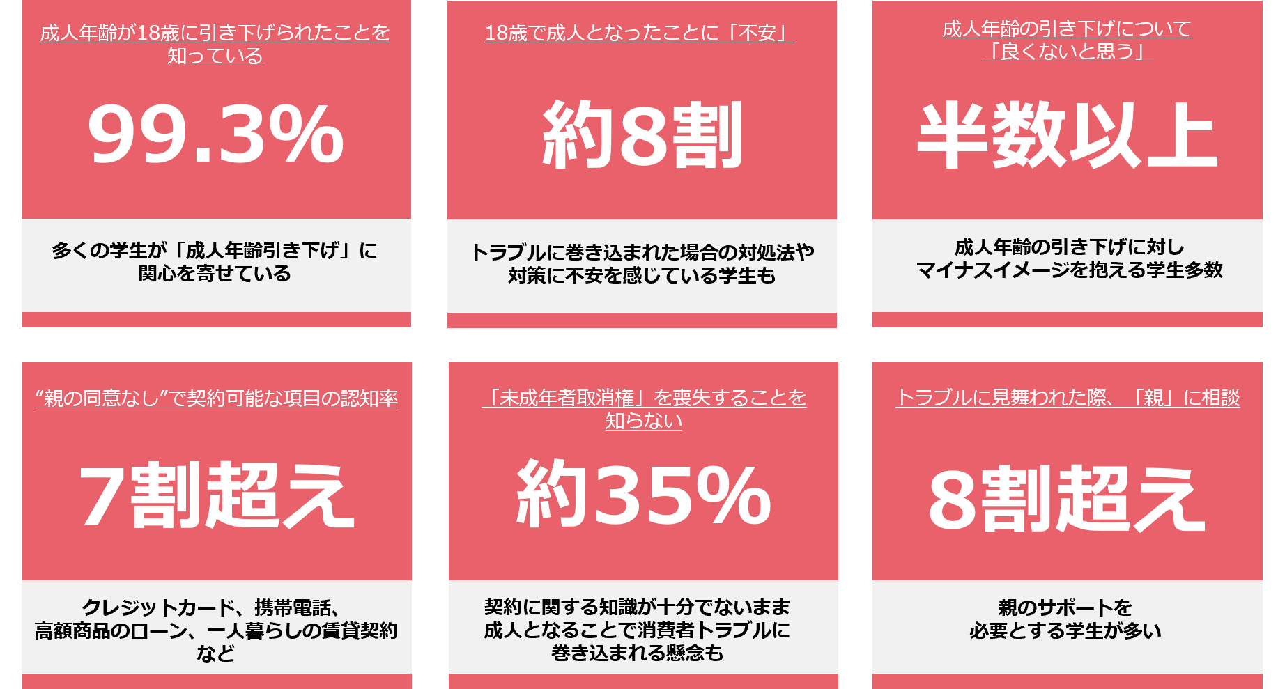 未成年者の場合、親の同意がない契約には未成年者の消費者被害を抑止する観点から「未成年者取消権」によって、その契約を取り消すことができます。しかし、成人年齢引き下げに伴い18歳や19歳であっても「未成年者取消権」を喪失することを知っている学生は65.1%にとどまりました。今後、知らず知らずのうちに消費者トラブルに巻き込まれないためにも、18歳、19歳の新成人は契約の取消ができなくなることに注意する必要があります。