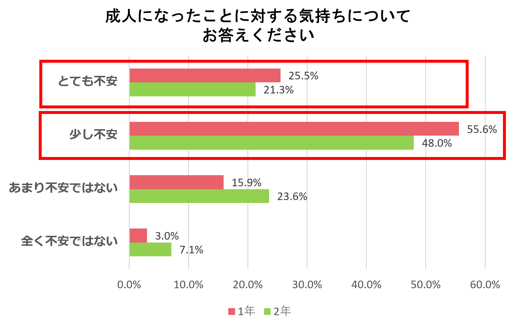 また、成人年齢の引き下げに対しどう思うか尋ねたところ、「どちらかといえば良くないと思う」「良くないと思う」と回答した学生は1・2年生合計で53.5%と半数以上にのぼりました。成人になったことに対する不安が、こうしたイメージにもつながっていると考えられます。