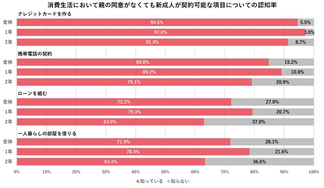 続いて「成人年齢引き下げ」に伴い、消費生活において18歳以上が親の同意がなくても法律上有効な契約ができるようになったことについての認知率を調べました。認知率の最も高かった項目は1・2年生合計で94.5%の学生が知っていると回答した「クレジットカードを作ることができる」(1年生97.0%、2年生91.3%)で、次いで84.8%の「携帯電話の契約ができる」(1年生89.2%、2年生79.1%)、72.2%の「高額商品の購入のためローンを組むことができる」(1年生79.3%、2年生63.0%)、71.9%の「一人暮らしの部屋を借りることができる」(1年生78.4%、2年生63.4%)の順で認知率が高いことがわかりました。