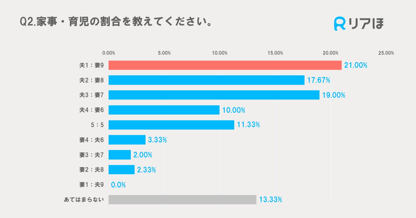 家事育児の家庭内での割合に関しては、「夫1:妻9」が最も多く21%となり、収入の割合に比例せず、妻に家事育児の負担が寄っていることがうかがえる結果となりました。