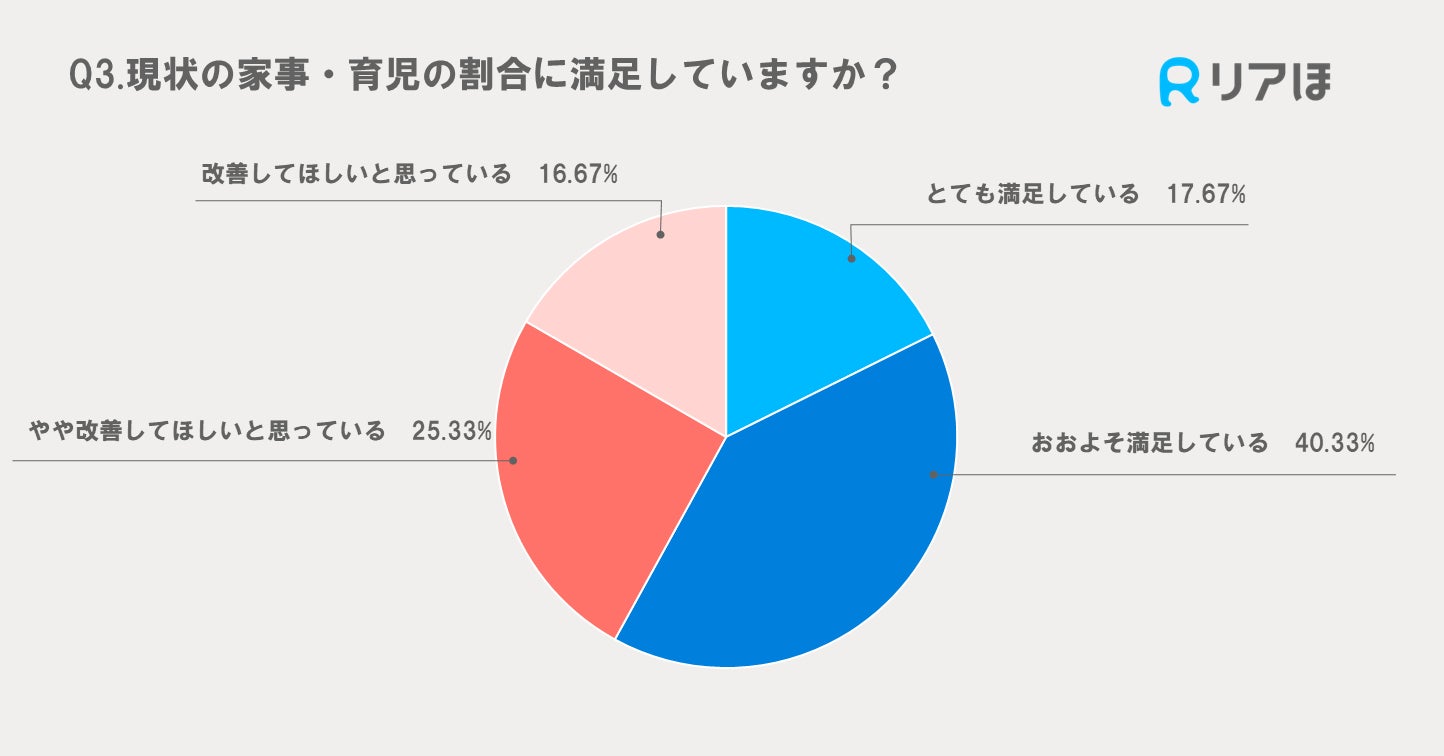 現状の家事育児割合の満足度については、「おおよそ満足している」が最も多く40.33%となりましたが、「やや改善してほしいと思っている」「改善してほしいと思っている」を合わせると42%となり、約4割の女性が、現状の家事育児について不満を抱えていることがわかりました。
