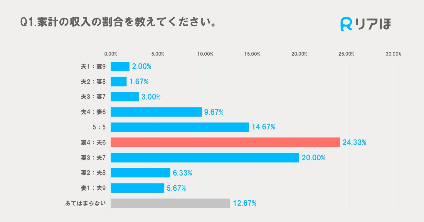 夫と子どもがいる働く女性に家計の収入割合を質問したところ、最も多かったのが「妻4:夫6」の24.33%、次いで「妻3:夫7」の20%となりました。