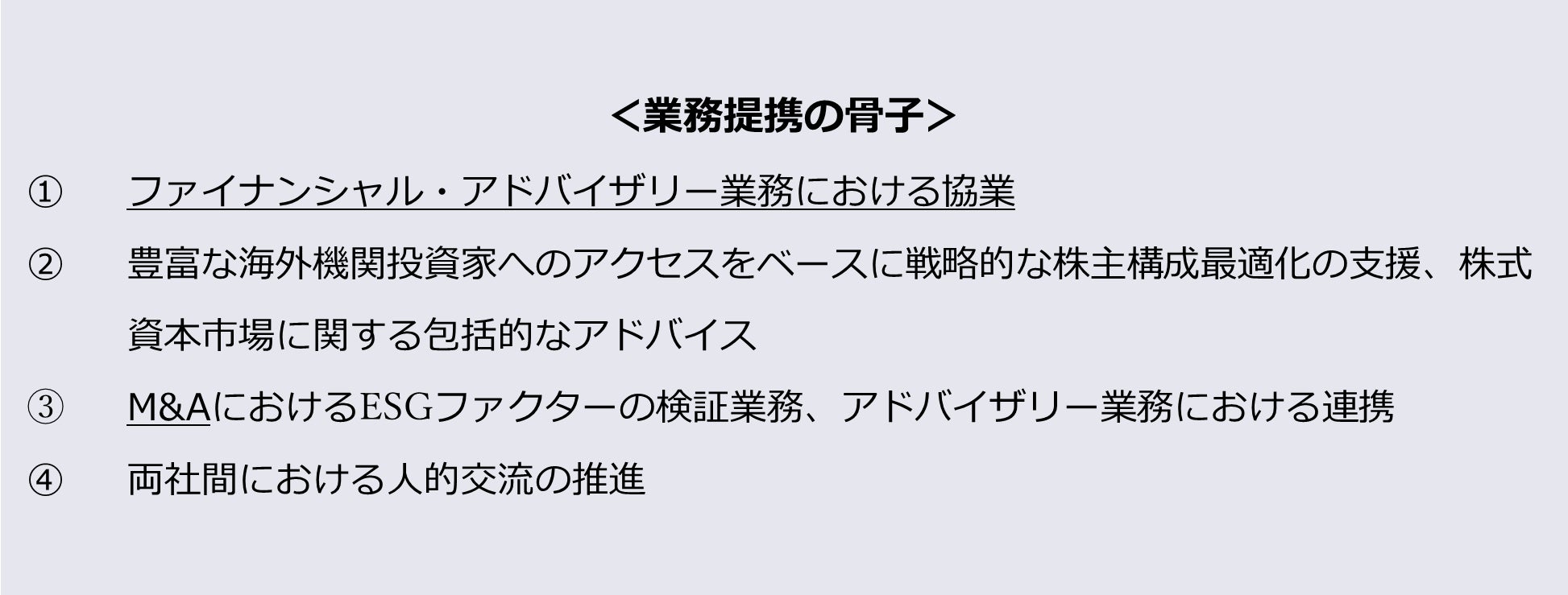 この度、既存の業務提携事項に加え、顧客上場企業の企業価値最大化を目的に次の項目について、業務提携を開始致します。