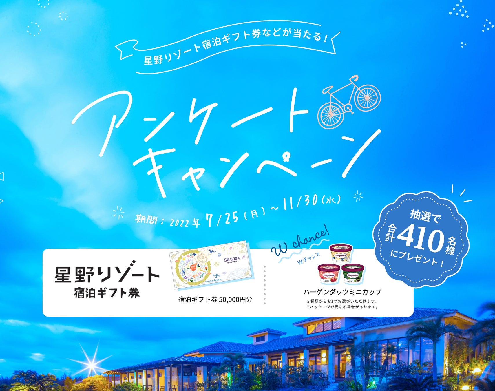 本キャンペーンでは、アンケートにお答えいただいた方の中から抽選で星野リゾート宿泊ギフト券5万円分をプレゼントするほか、Wチャンス賞としてハーゲンダッツミニカップがもらえる電子クーポンを抽選でプレゼントいたします。星野リゾート宿泊ギフト券は「星のや」をはじめ、サイクリングを楽しみながらお持ちの自転車と一緒に宿泊できる「BEB5土浦」など様々な宿泊施設への宿泊にご利用いただけます。