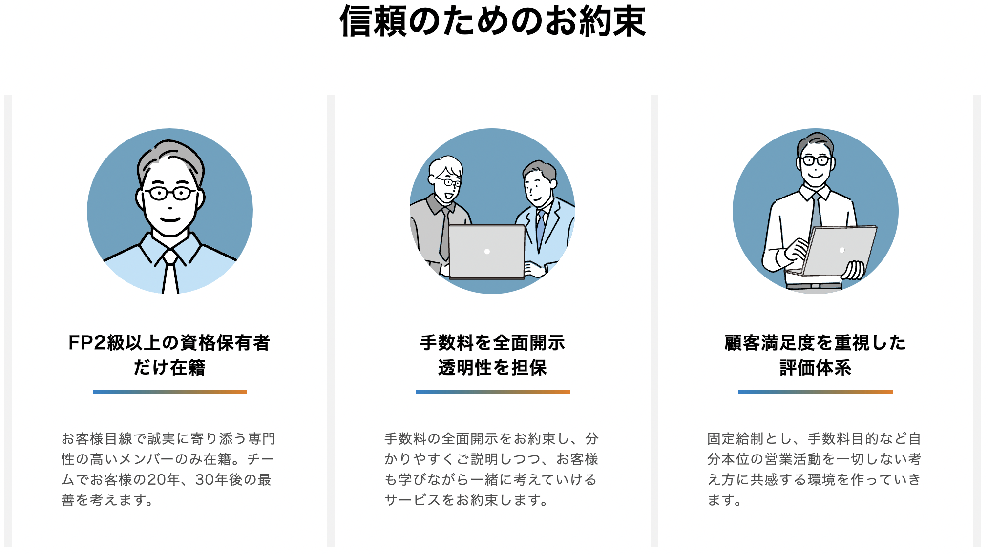 金融業界ではあまりない手数料の全面開示を実践してきたFMC金融研究所は、紳士的なお金の専門家集団の普及を目指して6月10日に法人化を開始しました。弊所の取り組みはお客様からの喜びの声も多く、2022年5月には「担当の対応に満足できそうな資産コンサルティング企業 第1位」を獲得しました。日本国民が経済面で安定する未来のために次世代の金融業界の常識を牽引していきます。