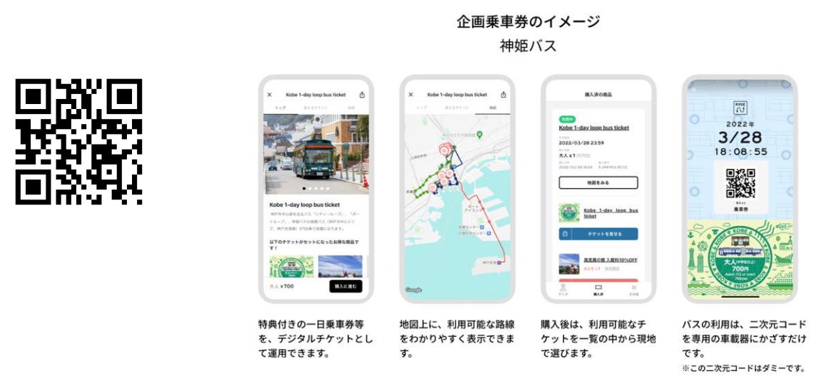 「Kobe 1-day loop bus ticket」「Kobe 2-day loop bus ticket」に対し、QRコード(※)で読み取る検札方式の導入により、現地でのオペレーションや乗車実績を検証し、今後の施策に生かします。対象企画券は「RYDE PASS」上で事前に購入いただけます。